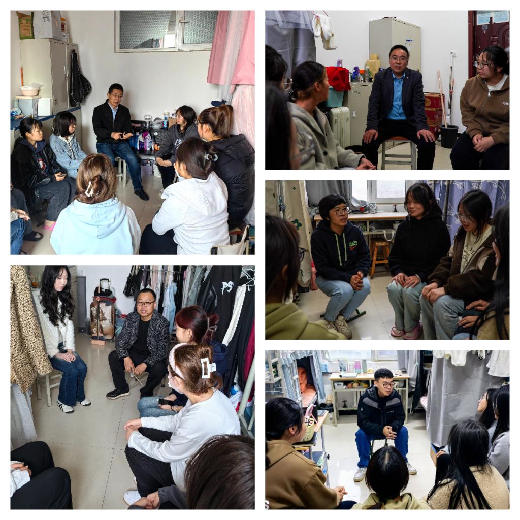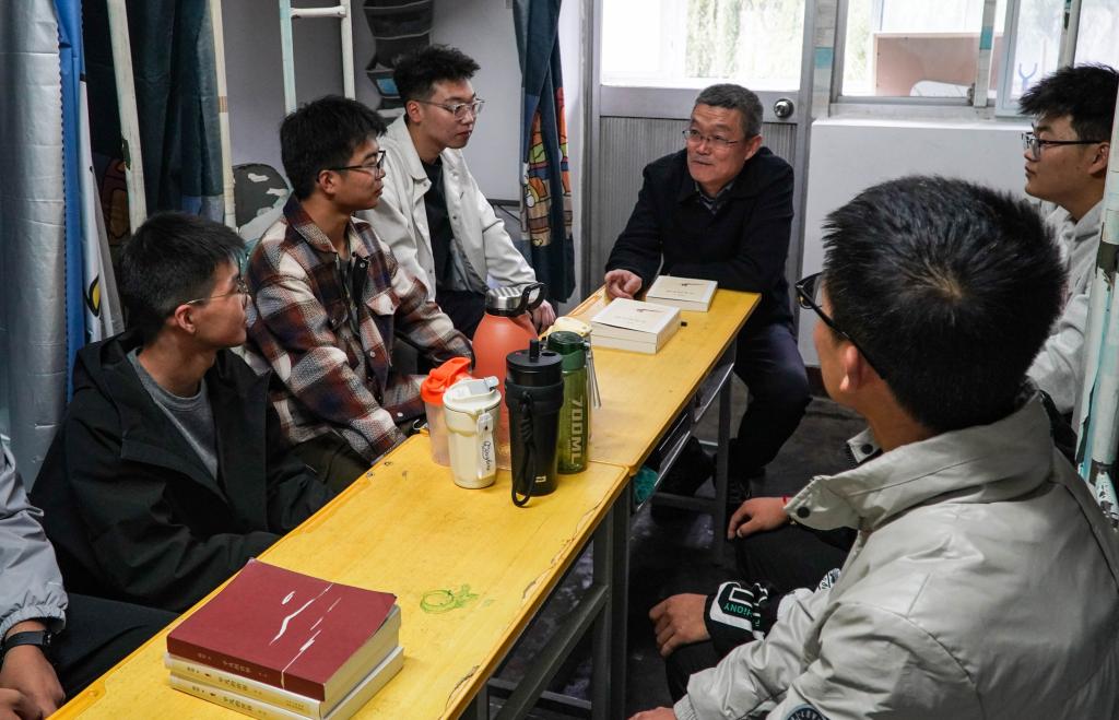 在学生宿舍,百名先进教师志愿服务团成员李强和24级植物科学与技术专业新生分享自己在矿区生态修复上走过的“奋斗路”。陕西省陕北绒山羊工程技术研究中心副主任朱海鲸和动物科学专业学生讲述陕北绒山羊产业在乡村振兴上的“致富路”。辅导员班主任们也分别深入宿舍,了解学生们在生活、学习和人际交往上的需求和困扰。
