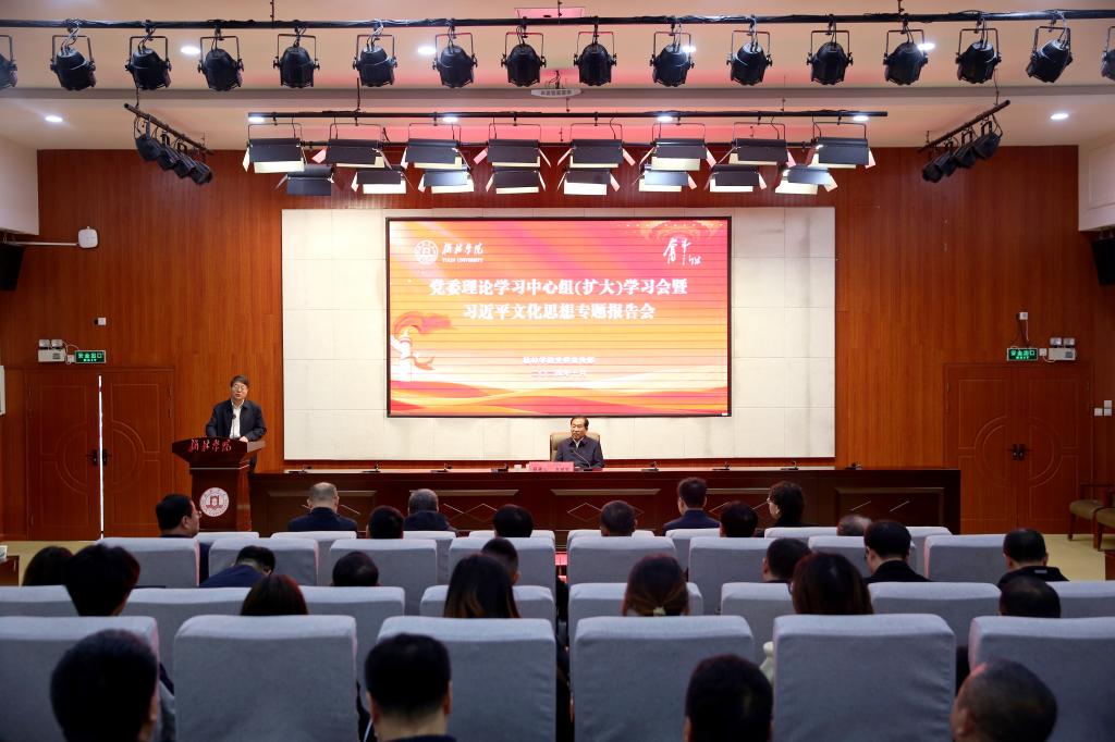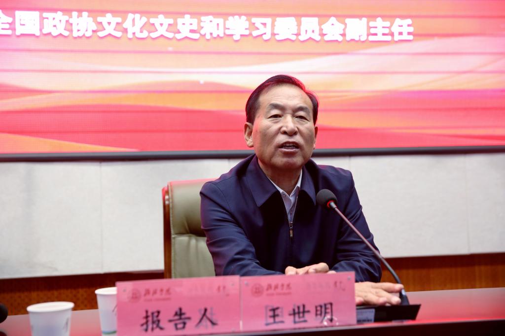 为深入学习贯彻习近平文化思想,10月29日上午,bat365党委理论学习中心组(扩大)学习会暨习近平文化思想专题辅导报告会在逸夫楼一楼报告厅举行。会上,中共中央宣传部原副部长、第十三届全国政协文化文史和学习委员会副主任王世明为bat365近200名师生作题为《关于文化自信的学习思考》的报告。榆林市委常委、宣传部部长徐刚出席,bat365党委书记张新柱主持,在家校领导,党委委员,各部门、各学院科级以上干部及部分学生代表参加。