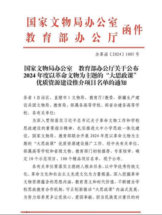 为深入贯彻落实习近平总书记关于革命文物工作和学校思政课建设的重要指示精神,扎实推进大中小学思政课一体化建设,国家文物局、教育部联合开展2024年度以革命文物为主题的“大思政课”优质资源建设推广工作。经中央有关单位、部属高等学校和省级文物、教育部门初核推荐、专家核审,确定10个示范项目、100个精品项目名单。