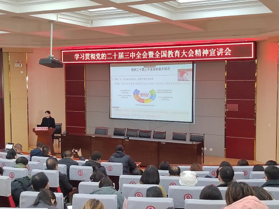 为进一步深入学习贯彻党的二十届三中全会精神和全国教育大会精神,深刻领悟习近平总书记重要讲话精神,切实把思想和行动统一到全会精神上来。11月28日下午,数学与统计学院、绥德师范学院通过线上线下相结合的方式联合召开学习贯彻党的二十届三中全会暨全国教育大会精神宣讲会。副校长马亚军出席并作专题辅导,宣讲团成员方小娟进行宣讲,数学与统计学院、绥德师范学院全体教职工参加,宣讲会由数学与统计学院党总支书记和绥德师范学院党总支常务副书记共同主持。
