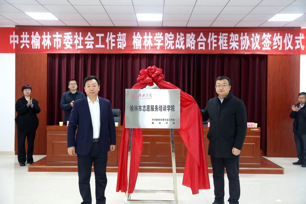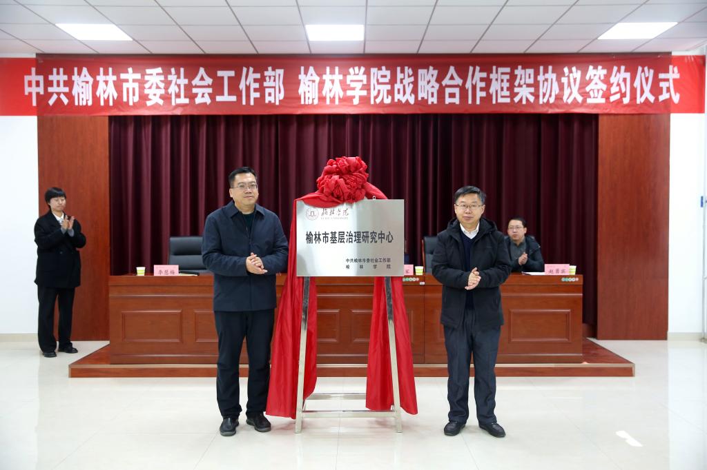 在签约仪式上,榆林市委社会工作部部长、市委两新工委书记李万昌与bat365副校长马亚军共同签署了“榆林市委社会工作部 bat365正版唯一官网战略合作框架协议”。陕西省委社会工作部李靖宇处长与bat365副校长马亚军共同为“榆林市志愿服务培训学院”揭牌。榆林市委社会工作部部长李万昌与bat365政法学院院长高谋洲教授共同为“榆林市基层治理研究中心”揭牌。
