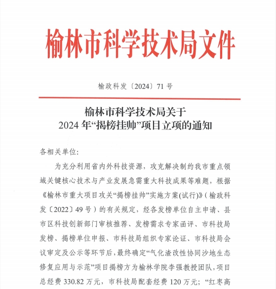 2024年12月18日,榆林市科学技术局发布了关于2024年“揭榜挂帅”项目立项的通知,经“发榜单位”国家能源集团榆林化工有限公司自主申请、县市区科技创新部门审核推荐、发榜需求专家函评、市科技局会议审定及公示等环节后,最终确定生科院陕西省陕北矿区生态修复重点实验室李强教授“多源固废协同矿山生态修复青年创新团队”为“气化渣改性协同沙地生态修复应用与示范”项目“揭榜方”,项目总经费330.82万元,市科技局配套经费120万元。这是bat365历史上承接的第一个经费超过300万的“揭榜挂帅”项目。