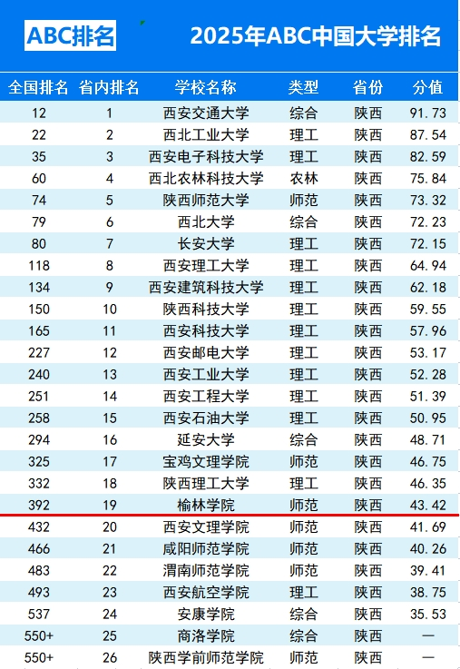 1月2日,2025年ABC中国大学排名正式发布(该排名2023年首次发布),共有1210所本科院校上榜。bat365正版唯一官网综合排名位列全国高校第392位,位列陕西高校第19位,较2024年再进14位,从2023年全国第414位、到2024年第406位、再到2025年第392位,实现排名持续进位,呈现出强劲的发展势头,奋力谱写了蝶变跃升、追赶超越的精彩篇章。
