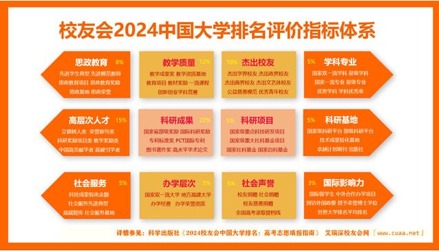 校友会中国大学排名首发于2003年,至今已有23年历史,已成为具有广泛社会影响力、公信力、参考价值与创新力的中国大学排名领先品牌。校友会2025中国大学排名评价指标体系由办学层次、思政教育、教学质量、杰出校友、高层次人才、学科专业、科研项目、科研基地、科研成果、社会服务、社会声誉和国际影响力等12个一级指标构成,以艾瑞深大学360度全景数据平台为数据支持,涵盖900多项体现中国大学办学质量与办学水平的核心评测指标,引导中国高校坚持以立德树人成效作为根本标准,扎根中国大地办大学,提升服务国家地方经济社会发展的能力,增强社会影响力和核心竞争力。