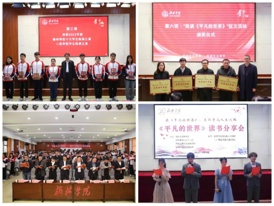 (二)“乐读”启智秉臻心。春季学期,以“4.23世界读书日”为契机,举办“乐读,让自己更美好”读书分享会、文化名家进校园等活动,发布书记校长推荐书单、图书借阅排行榜、学生读者借阅排行榜,表彰年度十大阅读之星,激发学生阅读热情。秋季学期,举办“走进公寓问需求,畅谈平凡话奋斗”、我读《平凡的世界》征文、名师导读系列讲堂、纪念路遥诞辰、团学青年读书沙龙、第二届微信读书大赛等读书活动,以新鲜生动、喜闻乐见的方式激发广大学生参与“乐读”的积极性,提升学生综合素养。
