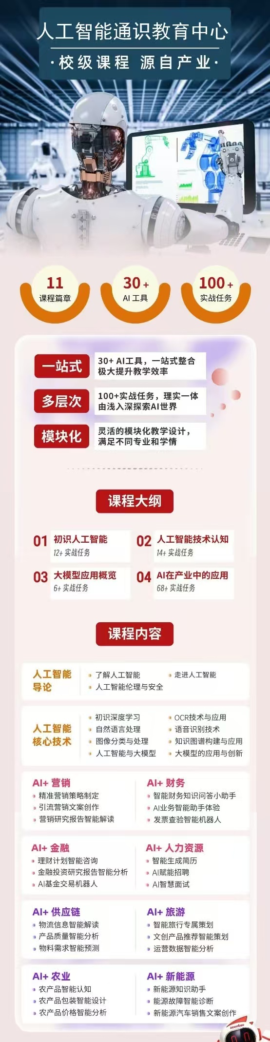 人工智能通识教育中心未来将面向国家需求和行业难点,通过人工智能通识教育与产业学院深度融合,形成“理论+案例+实训”三位一体的教学模式。在课程设计中,分层次递进产教协同人工智能教育创新实验室,创新人工智能通识课教程,坚持以人工智能通识与专业知识融合、产业需求与创新实践教育融合为抓手,统筹能源化工与人工智能、生态农业与大数据等领域的跨学科课程开发,发挥人工智能在赋能传统学科和推动学科交叉融合方面的重大作用,全面推进新工科、新农科、新文科和新师范建设,系统性设计人工智能+微专业、人工智能+微课程等人才培养体系,分类分层建设AI通识课程模块、AI专业交叉课程模块和高阶AI创新课程模块等,全面提高学生的人工智能知识素养和创新思维,培养满足人工智能时代需求的创新人才。