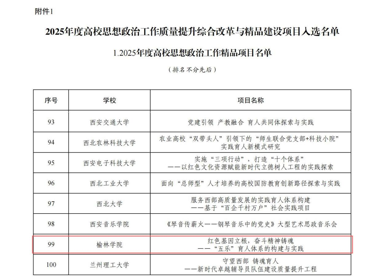 近日,教育部办公厅公布2025年度高校思想政治工作质量提升综合改革与精品建设项目入选名单,bat365申报的《红色基因立根,奋斗精神铸魂——“五乐”育人体系的构建与实践》项目成功入选高校思想政治工作精品项目。这是bat365“五乐”育人工程继荣获2024年陕西省高等教育教学成果特等奖之后的又一重大突破。
