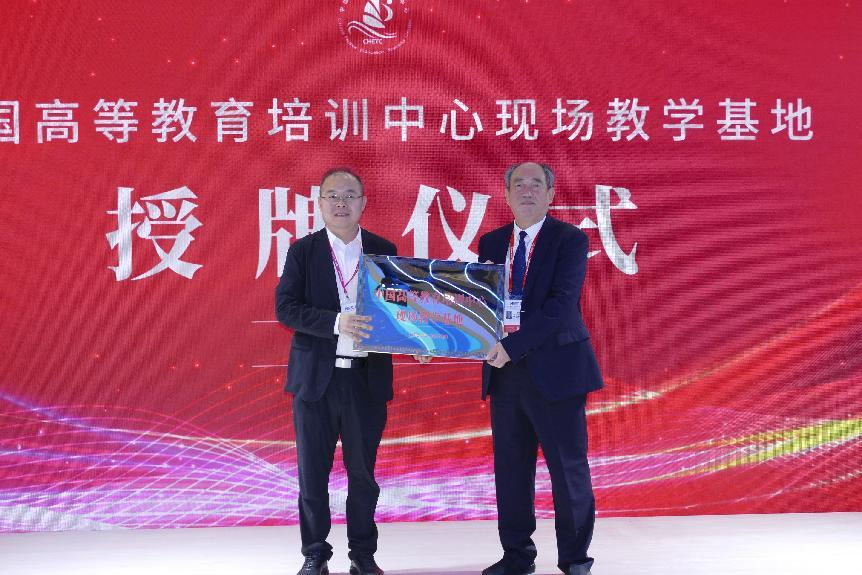 5月23日,在第63届高等教育博览会举办之际,中国高等教育培训中心现场教学基地授牌仪式在长春东北亚国际博览中心举办。中国高等教育学会会长林蕙青,学会副会长、培训中心主任姜恩来,学会监事长、中国高等教育培训中心党委书记孙维杰,学会副会长、秘书长李楠等领导出席授牌仪式。校党委副书记闫龙代表学校郑重地接过这份充满荣誉与责任的牌匾。