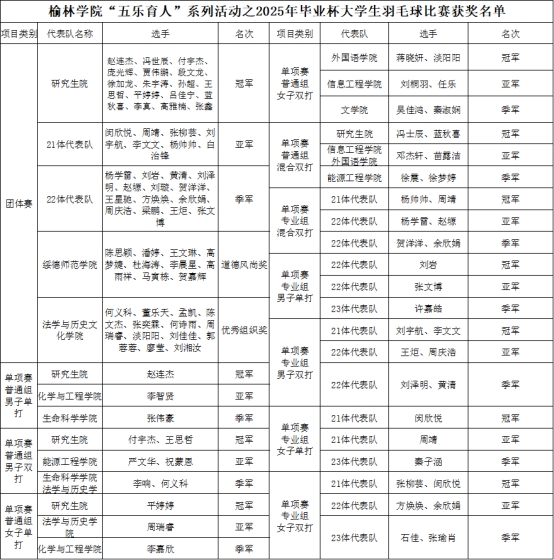 经过激烈角逐,研究生院代表队摘得团体赛桂冠;体育学院21级、22级代表队分获亚季军。闵欣悦、平婷婷荣获女子单打冠军;周靖、周瑞睿荣获亚军;秦子涵、李嘉欣荣获季军。赵连杰、李智贤、张伟豪等同学分别荣获男子单打比赛普通组的冠、亚、季军;刘岩、张文博、许嘉皓等同学分别荣获男子单打比赛专业组的冠、亚、季军;刘宇航、李文文、王炬、周庆浩、刘泽明、黄清等同学分别荣获男子双打专业组冠军、亚军、季军。付宇杰、王思哲、严文华、祝蒙恩、李响、何义科等分别荣获男子双打普通组冠军、亚军、季军。杨帅帅、周靖荣获男女混双比赛专业组冠军;杨学雷、赵塬荣获亚军;贺洋洋、余欣娟荣获季军。冯世辰、蓝秋喜荣获非专业组冠军;邓杰轩、苗露洁荣获亚军;徐震、徐梦婷荣获季军。绥德师范学院代表队荣获道德风尚奖;法学与历史文化学院荣获优秀组织奖。