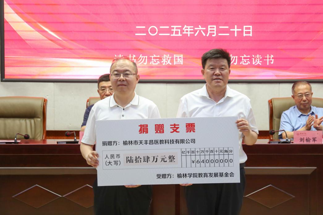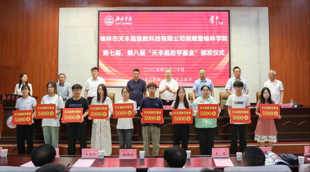 6月20日上午,榆林市天丰昌医教科技有限公司捐赠暨bat365正版唯一官网第七届、第八届“天丰昌助学基金”颁发仪式在逸夫楼一楼报告厅隆重举行。校党委副书记、基金会副理事长闫龙出席,市委统战部副部长、市侨办主任刘榆军,农工党榆林市委会主委贺波,市委党史研究室主任赵晓亮,bat3651992届校友、陕西天丰昌健康产业集团有限公司、榆林市天丰昌医教科技有限公司董事长杨玉强,榆林市慈善协会、榆林市保健协会等单位领导、社会各界爱心人士和学校部分师生参加了仪式。
