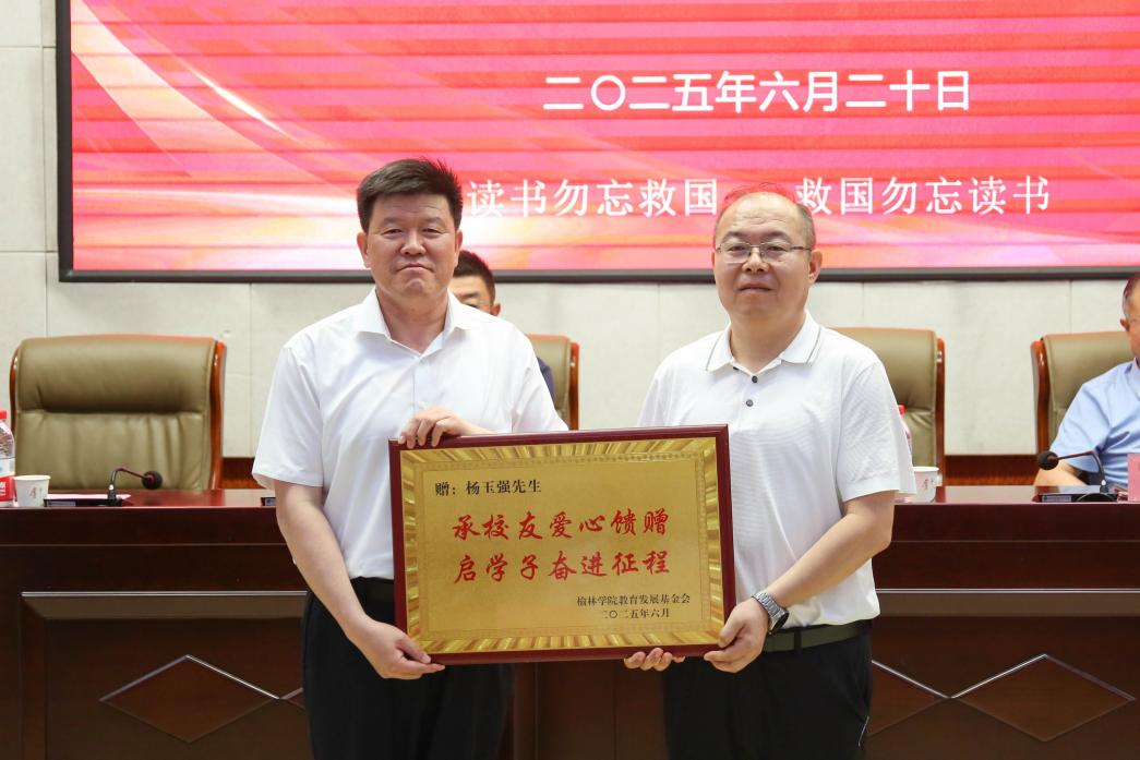 校友杨玉强作了质朴真挚、情深意切的讲话。他表示,看到母校发展越来越好,感到非常自豪。自己多年以来的成长和成就得益于母校的教育。今天的母校发展上了一个大台阶,实现了质的飞跃,更好地推动了地方经济社会高质量发展。天丰昌集团一直关注社会公益事业、重视社会责任担当,希望通过此次活动带动社会各界对教育事业倾注更多的爱心和支持,给需要帮助的学子多一份关爱,为榆林的教育事业尽一份绵力。