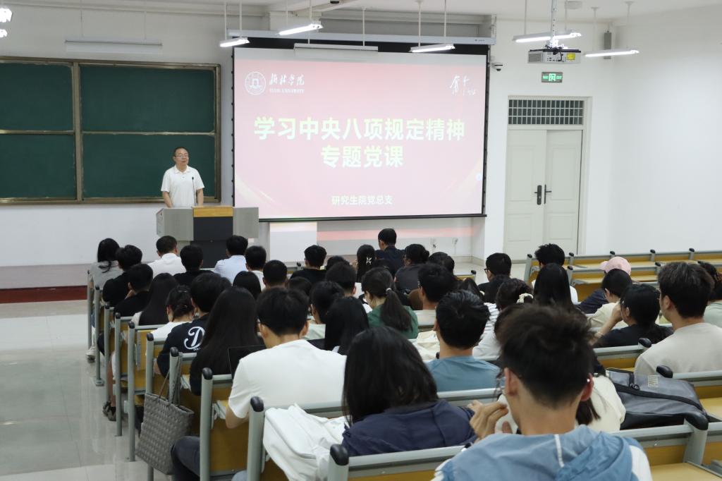 6月24日下午,校党委副书记闫龙在子洲楼321室为研究生院师生党员讲授《深入贯彻中央八项规定精神学习教育,加强党的作风建设,推进研究生教育高质量发展》专题党课。
