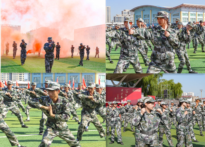 随后,参训新生进行了擒敌拳、匕首操、战术演练等军事科目展示,军训教官表演了精彩的倒功操。