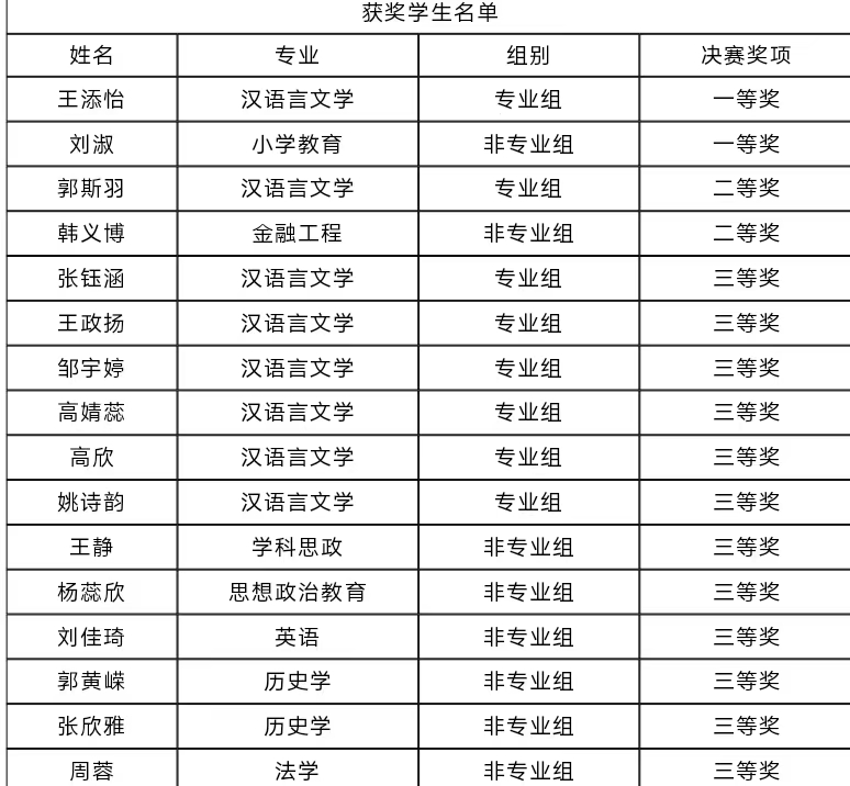 此次大赛中,bat365还收获多项集体与个人荣誉:bat365文学院获评“优秀组织单位”,文学院王年年、李娜两位老师获评“优秀指导老师”,张义男同学获评“优秀组织者”,李美君、曹楠、付景鑫三位同学荣获“优秀志愿者”称号。