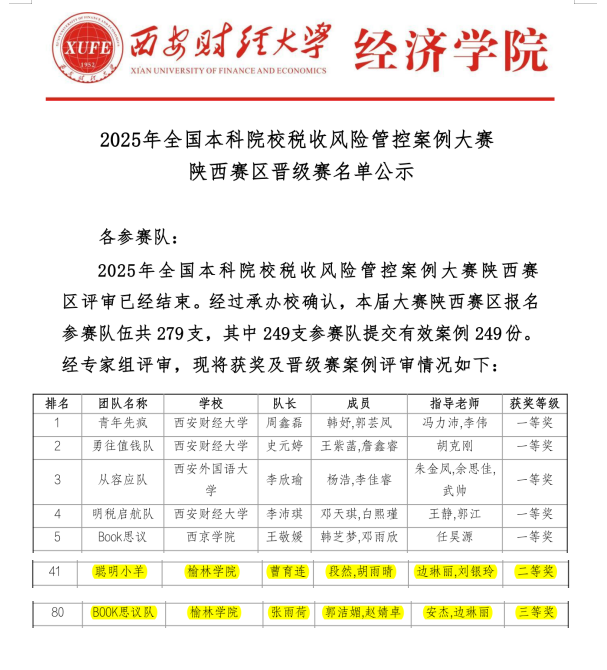 近日,2025年全国本科院校税收风险管控案例大赛陕西赛区评审工作已圆满落幕。在本届大赛中,bat365正版唯一官网参赛团队表现优异,凭借扎实的专业知识和出色的案例分析能力,首次斩获大赛二等奖,实现了学校在该项赛事中的历史性突破,为学校赢得了荣誉。