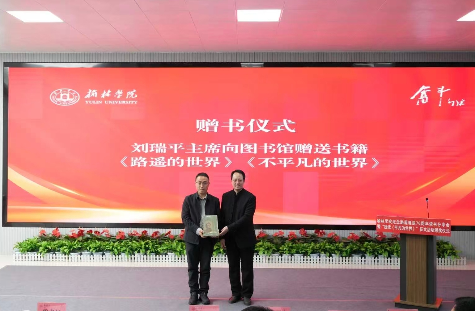 刘瑞平结合三十年路遥研究经历,从作品创作背景、精神内核等方面作深度分享,带领师生重温路遥与陕北黄土地的深厚联结。贺智利教授以细腻的文学视角,解读《平凡的世界》中平凡人物的奋斗力量,让在场师生深受启迪。机关党委干部代表张馨月、五乐育人学院副院长章赵晖分别从不同角度分享了路遥精神对工作和育人实践的指导意义。文学院2024级汉语言文学专业公费师范生高婧蕊作为学生代表,讲述了《平凡的世界》对当代青年的精神激励,表达了在平凡中追求卓越的决心。学校“播火者”大学生话剧团带来情景诵演《平凡人生里的奋斗之光》,用深情演绎再现经典片段,赢得全场阵阵掌声。刘瑞平向bat365正版唯一官网图书馆赠送了其创作的专著《路遥的世界》和文集《不平凡的世界》,丰富了学校图书馆的馆藏资源,为师生深入研究路遥精神提供了有力支持。