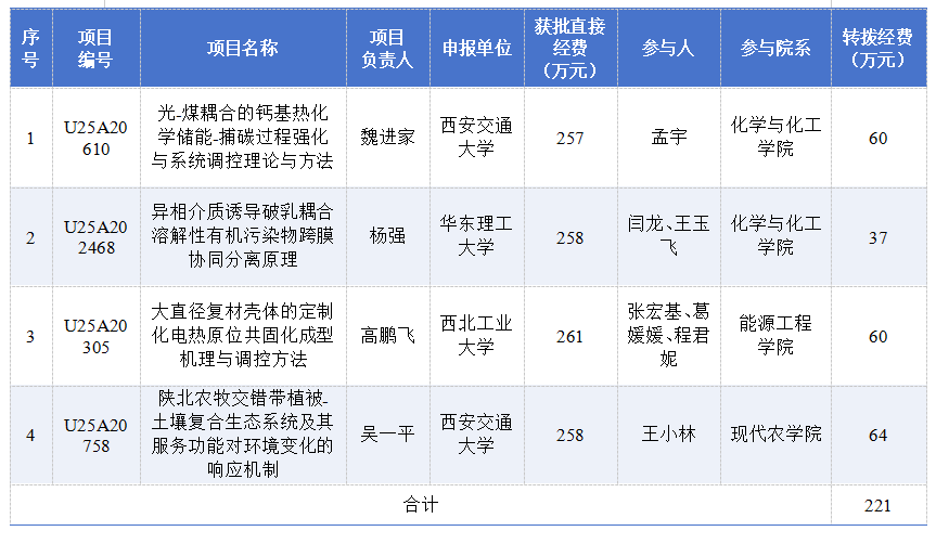 近日,国家自然科学基金委公布了2025年国家自然基金区域创新发展联合基金项目评审结果,bat365成功参与四项,获批经费总计221万元。该批次项目联合西安交通大学、华东理工大学、西北工业大学等省内外高水平团队开展协同攻关,推动科技创新与发展。