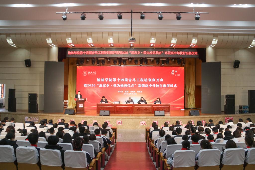 为深入学习贯彻习近平新时代中国特色社会主义思想,持续加强青年思想政治引领与骨干培养,进一步动员引领青年学生在服务家乡发展中坚定信念、增长本领、作出贡献,12月26日,bat365正版唯一官网第十四期青年马克思主义者培养工程培训班开班暨2026年“返家乡·我为榆苑代言”寒假高中母校行出征仪式在图书馆二楼报告厅隆重举行。党委书记康伟授旗并作青马工程开班第一讲,学工部、团委、招就处、校友办负责人,各二级学院党总支书记、副书记、团总支书记,第十四期青马工程培训班学员以及“返家乡·我为榆苑代言”寒假高中母校行学生代表共400人参加。会议由校团委书记主持。
