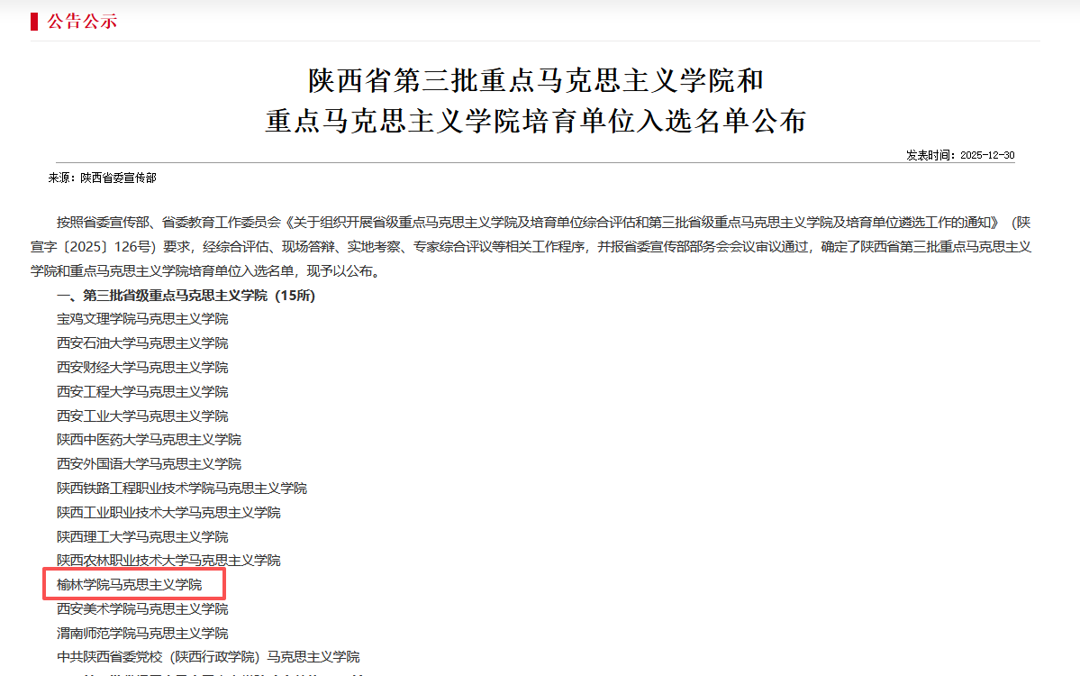 马克思主义学院成功入选第三批“陕西省重点马克思主义学院”,这是对学校坚持社会主义办学方向、落实立德树人根本任务的充分肯定。校党委高度重视马克思主义学院建设,持续深化思政课改革创新,推动其成为教育教学、学科建设、研究宣传和人才培养的重要平台。学校成立全国第三、陕西首家中共党史党建学院,深耕党史党建理论研究;中共党史党建学学术硕士点完成首届招生,稳步推进人才培养工作;分别与中国人民大学党史党建学院、华南师范大学中共党史党建研究院签署战略合作框架协议,深化学术交流与合作。成功举办第二届“牢记嘱托 铸魂育人”应用型高校大思政建设联盟2025年年会,开展“重走转战陕北路”“校友毕业三十年”等特色活动,成立“同心育人 培根铸魂”陕北大中小学思政课一体化建设联盟、“榆林市高校民族团结进步促进联盟”,“大思政课”育人格局不断完善。培根铸魂,深入推进“三全育人”综合改革,持续擦亮“五乐育人”、新生思政教育“四部曲”等育人品牌,思政引领力持续增强。