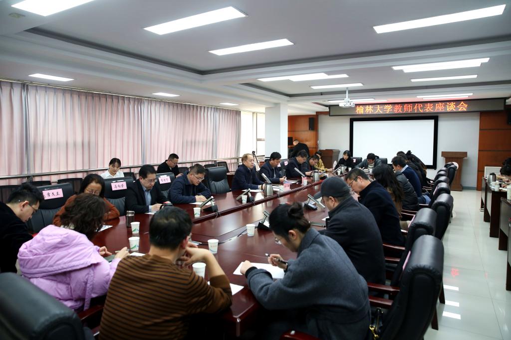 在全校深入开展树立和践行正确政绩观学习教育之际,为切实畅通沟通渠道,广泛倾听一线教师心声,凝聚办学治校合力,3月19日下午,榆林大学在行政楼四楼会议室召开教师代表座谈会,党委副书记、校长付峰出席并主持,党委副书记马亚军出席,各学院教师代表参加座谈。