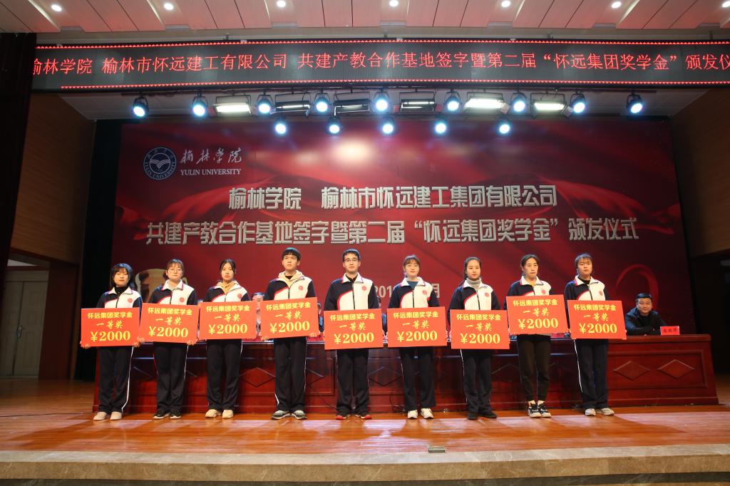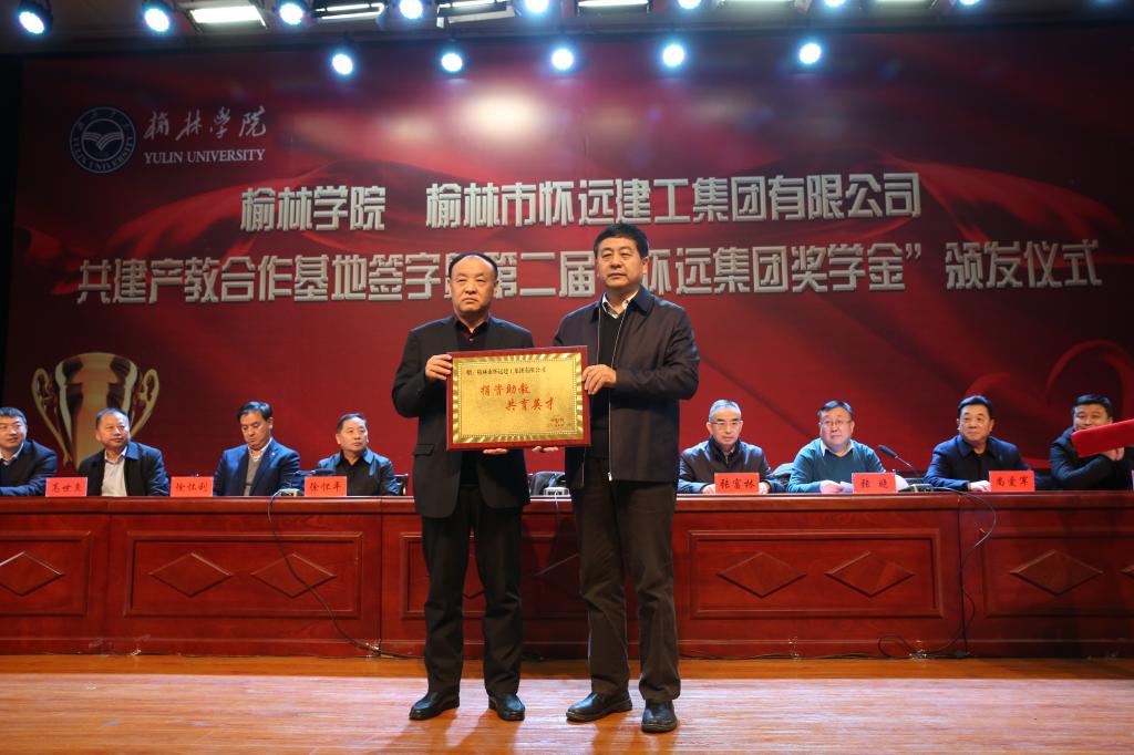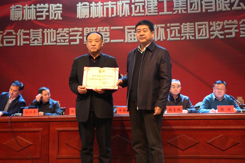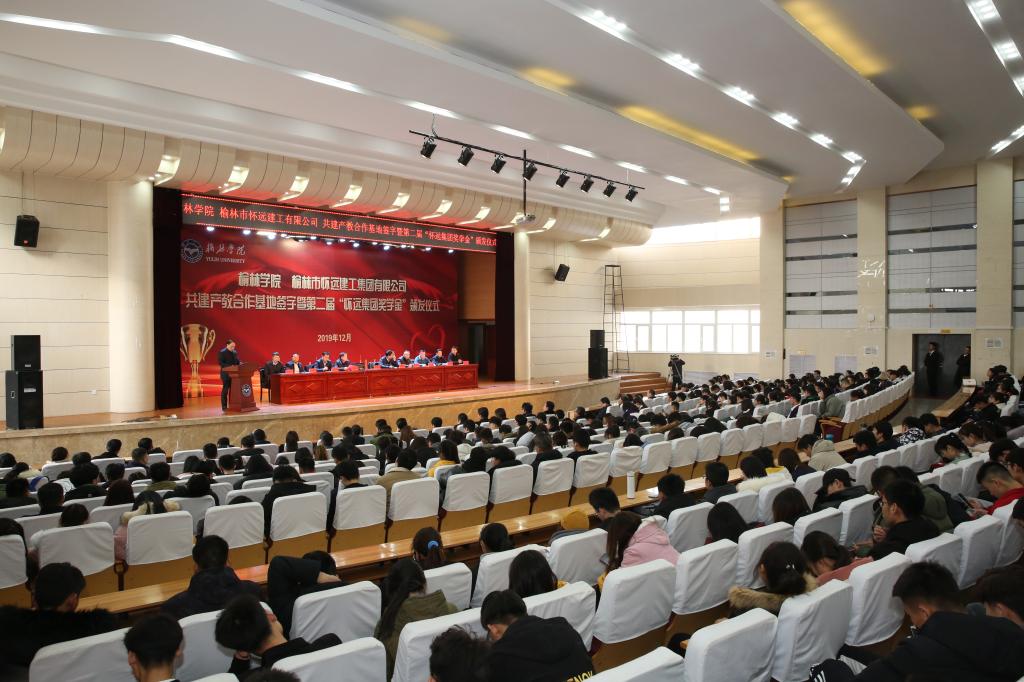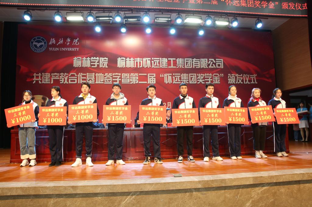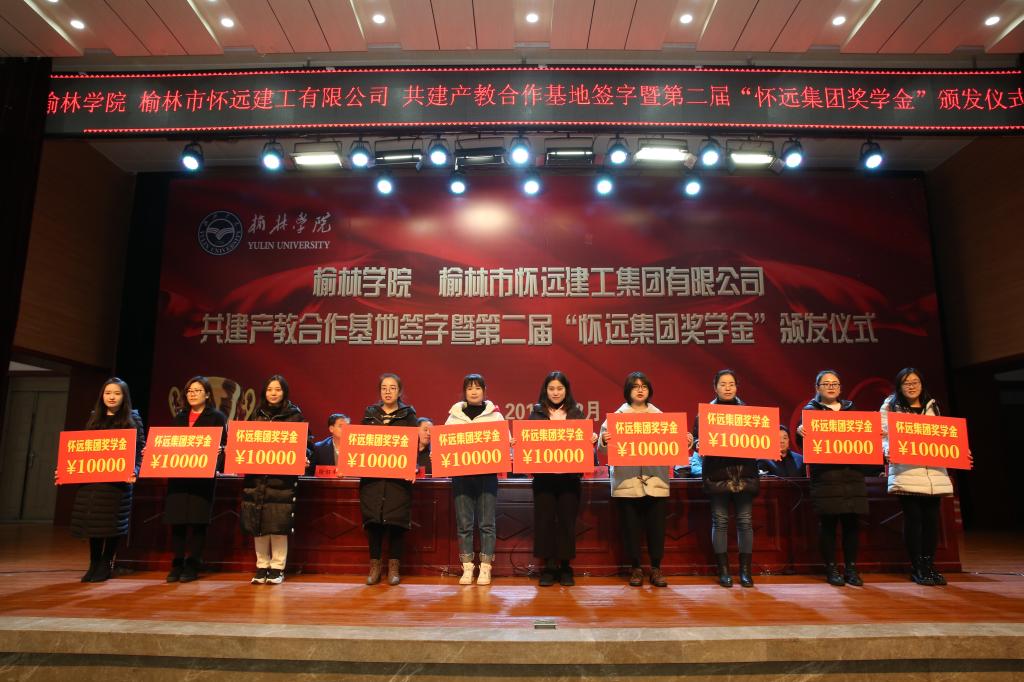2019年12月16日下午,bat365与榆林市怀远建工集团有限公司共建产教合作基地签字暨第二届“怀远集团奖学金”颁发仪式在校图书楼学术报告厅举行。怀远建工集团两年累计出资70万元,共资助bat365217名本科生;今年还奖励了bat365录取的首届研究生35人, 每人10000元。