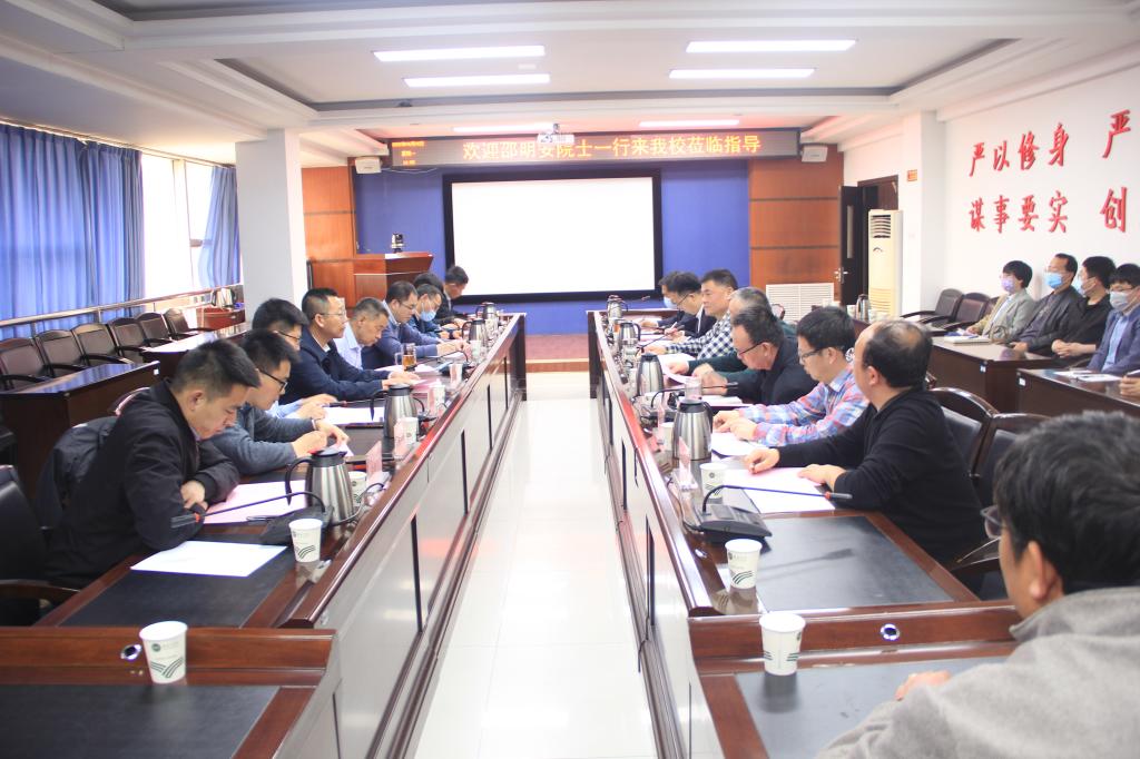 许云华代表学校对邵明安院士一行来校考察调研表示热烈欢迎。他从历史沿革、新校区规划、教学工作、师资队伍、人才培养以及社会服务等方面介绍了学校的基本情况,指出bat365能源化工、生科和文科类专业发展势头良好,获得了社会和市场的一致认可。学校聚焦“三文”“三黄”“三化”,以师范为底色,能源化工和生科为特色,实现高质量发展,正在努力完成升大目标。希望邵明安院士团队能在联合打造国家与省部级重大科研项目与科技成果方面给予指导和支持。