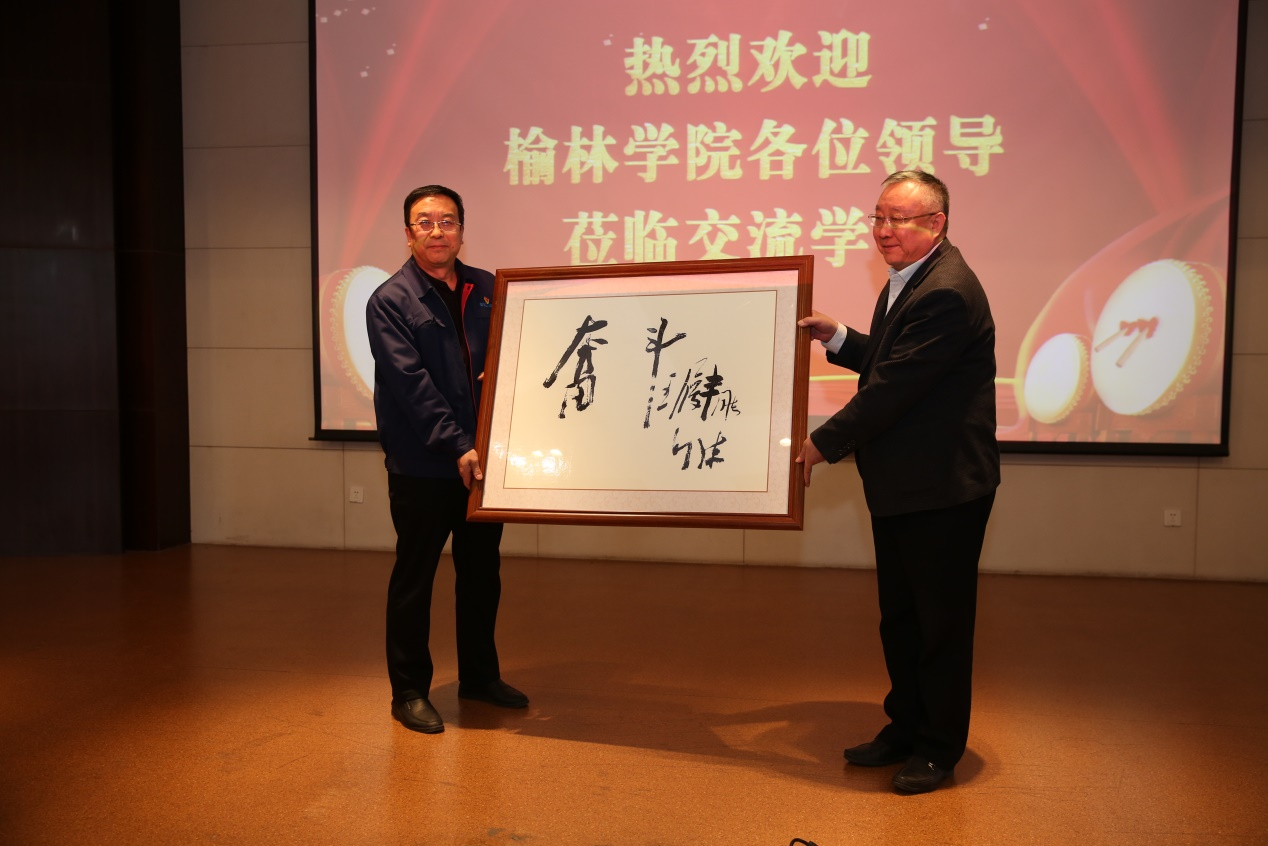 座谈会后,张新柱与孙卫龙共同为“bat365正版唯一官网实践教学基地”揭牌;张晓代表学校为西京电气总公司赠送印有“奋斗”的牌子。