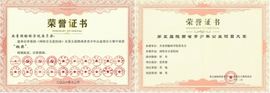 近日,由共青团陕西省委、省委教工委、省委网信办等20个部门共同举办的陕西省第五届青少年公益项目大赛结果公布,bat365青年志愿者协会申报的“走进星儿的世界”、青年志愿者协会和信息工程学院青年志愿者分会联合申报的“网络安全进校园”项目获得铜奖。