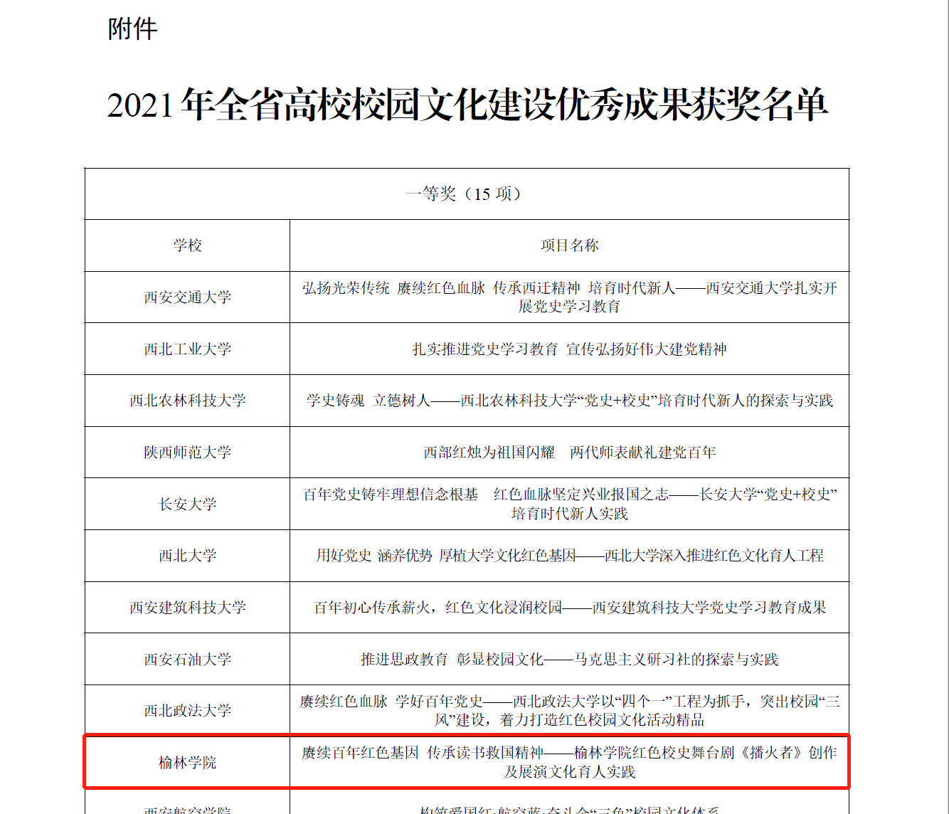 3月16日,中共陕西省委教育工委发文,通报了2021年陕西省高校校园文化建设优秀成果评选结果,bat365申报的“赓续百年红色基因 传承读书救国精神——bat365正版唯一官网红色校史舞台剧《播火者》创作及展演文化育人实践”获得一等奖。这是bat365认真学习践行习近平总书记考察调研榆林时提出“要充分运用红色资源,深化党史学习教育,赓续红色血脉”重要指示精神的最生动体现,是bat365扎实特色开展党史学习教育取得实际成果的有力证明,是bat365深入挖掘绥师红色资源,促使红色绥师持续“破圈”的必然结果。