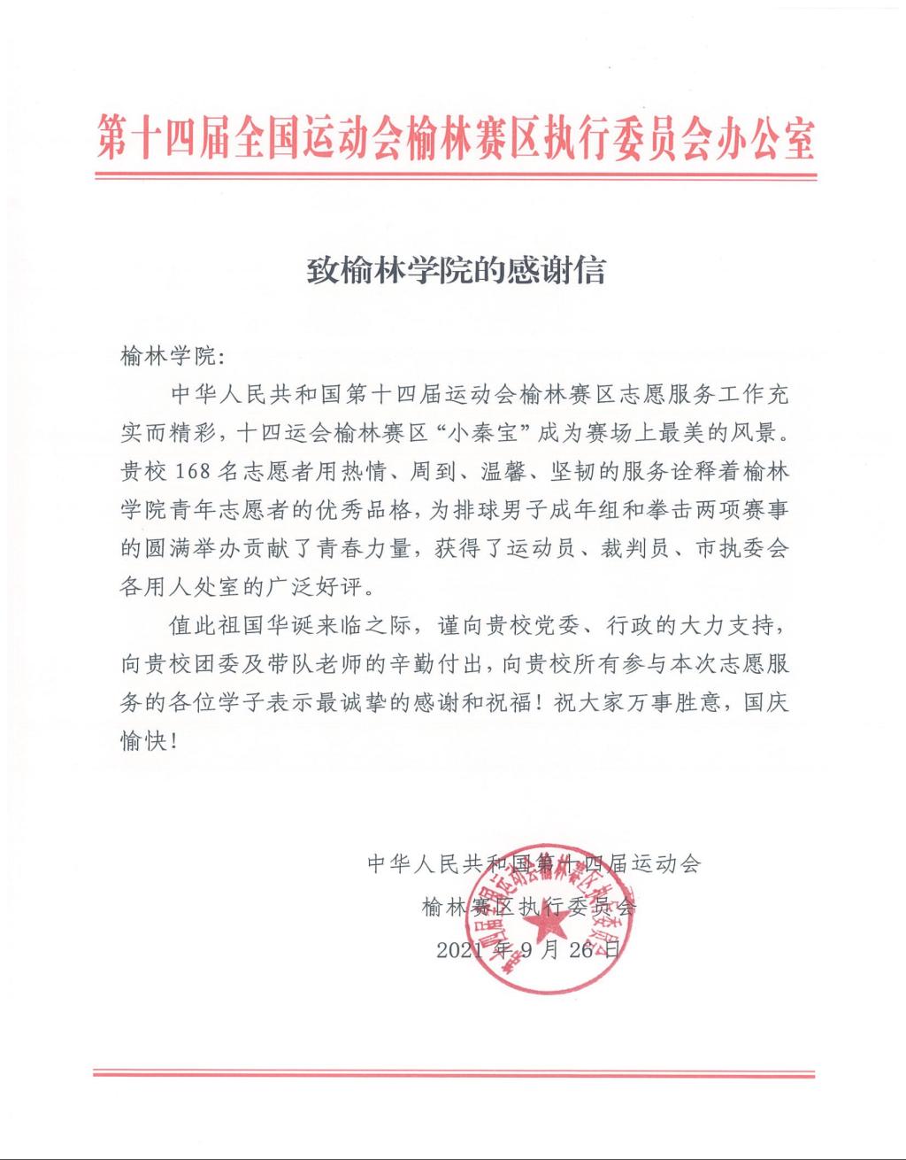 根据第十四届全国运动会榆林赛区执行委员会的安排,bat365认真贯彻落实习近平总书记“办一届精彩圆满的体育盛会”的重要指示精神,严格遴选了一支由168名学生组成的专业素质硬、综合能力强、精神面貌好的志愿者队伍,配备带队管理教师4名,参与各项赛事服务工作,圆满完成了各项工作任务,为十四运会和残特奥会的顺利举办贡献了青春力量。bat365168名大学生志愿者用自己的实际行动诠释了“奉献、友爱、互助、进步”的志愿服务精神,展现出了新时代青年大学生的良好精神风貌,受到了充分肯定和好评,取得了良好社会影响。