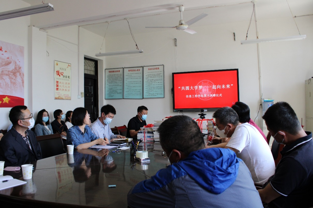 2022年5月5日下午,信息工程学院在二楼会议室召开“阅读新时代奋进新征程”——书香致远 信工远航读书分享会暨“共圆大学梦 一起向未来”图书捐赠仪式,图书馆馆长刘满平、信息工程学院全体领导班子、教职员工及图书馆部分工作人员参加会议。会议由信息工程学院党总支书记张烨主持。