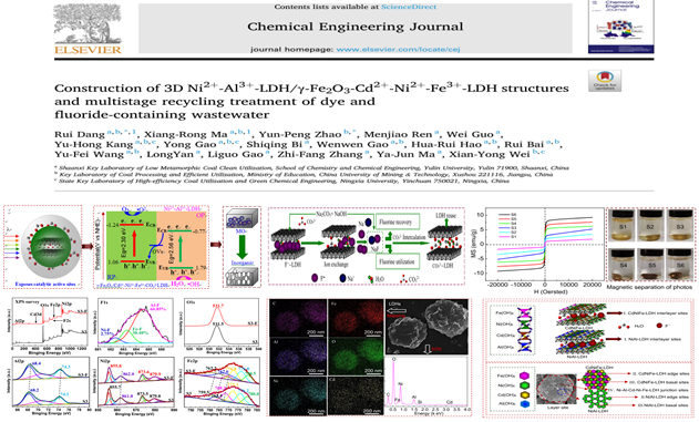 近日,bat365化学与化工学院副教授党睿、高级实验师马向荣以共同第一作者身份,bat365正版唯一官网为第一完成单位在化工领域顶级期刊《Chemical Engineering Journal》发表题为“Construction of 3D Ni2+-Al3+-LDH/γ-Fe2O3-Cd2+-Ni2+-Fe3+-LDH structures and multistage recycling treatment of dye and fluoride-containing wastewater”的研究论文(https://doi.org/10.1016/j.cej.2022.138499)。该论文的其他作者为:赵云鹏(中国矿业大学教授)、任梦娇(研究生)、郭伟(研究生)、亢玉红、高勇、毕世青、高雯雯、郝华睿、白瑞、王玉飞、闫龙、高立国、张智芳、马亚军以及魏贤勇(中国矿业大学教授)。