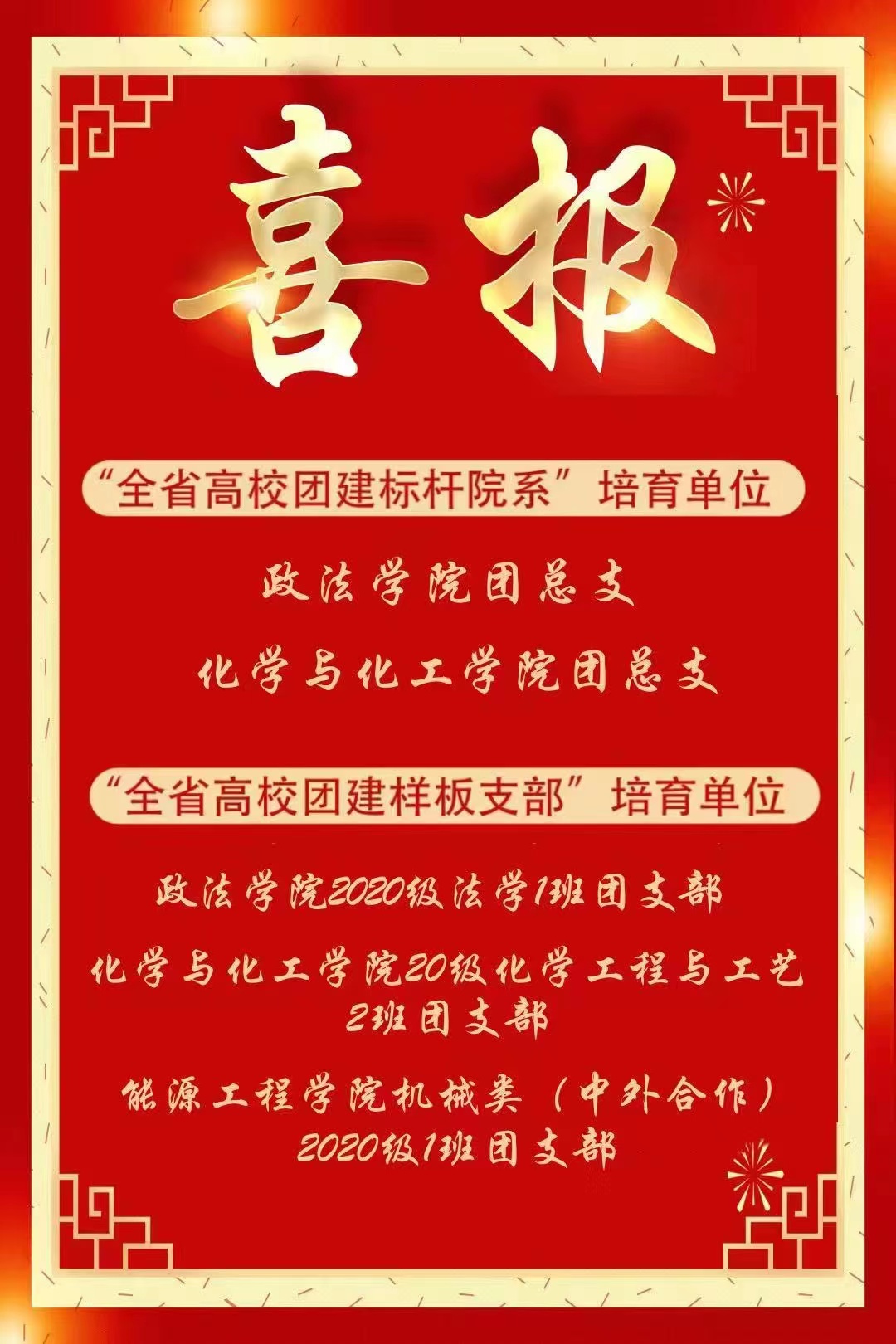 近日,共青团陕西省委和陕西省委教育工委联合印发了《关于确认全省学校团建示范单位培育资格的通知》,bat365政法学院团总支 、化学与化工学院团总支入选“全省高校团建标杆院系”培育单位;政法学院2020级法学1班团支部 、化学与化工学院20级化学工程与工艺2班团支部 、能源工程学院机械类(中外合作)2020级1班团支部入选“全省高校团建样板支部”培育单位。