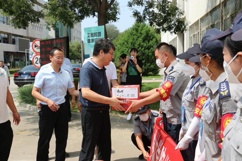 在保卫处,张新柱许云华询问了校园整体安全情况,并与校大门值班岗一线工作人员亲切交流,对大家在疫情防控工作体现出的奋斗精神表示高度认可。勉励大家,安全工作是学校各项工作的基础,是底线和红线,大家一定要恪尽职守,继续发扬奋斗精神,加强疫情防控,坚决守住校园安全防线,为师生营造安心、舒心、放心地学习、工作、生活环境。