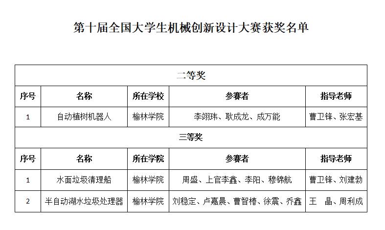 近日,由陕西省教育厅主办、西安科技大学承办的第十届全国大学生机械创新设计大赛陕西赛区竞赛结束。经竞赛评委会评定、组委会审核,本次全国大学生机械创新设计大赛陕西赛区共评出一等奖113项、二等奖205项、三等奖136项,bat365能源工程学院学子荣获全国二等奖1项,三等奖2项。其中曹卫锋、张宏基老师指导下,李翊玮、耿成龙、成万能同学设计制作的《自动植树机器人》荣获二等奖;曹卫锋、刘建勃老师指导,周盛、上官李鑫、李阳、穆锦航同学设计制作的《水面垃圾清理船》荣获三等奖;王晶、周利成老师指导,刘稳定、卢嘉晨、曹智椿、徐震、乔鑫同学设计制作的《半自动湖水垃圾处理器》荣获三等奖。