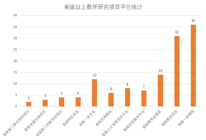 学校积极深化教育教学改革与创新,承担国家级新工科、新农科研究与实践、卓越农林等国家级项目5项,省级新工科、新文科研究与实践项目等各类项目平台40余项,省级教改项目、一流课程60余项。