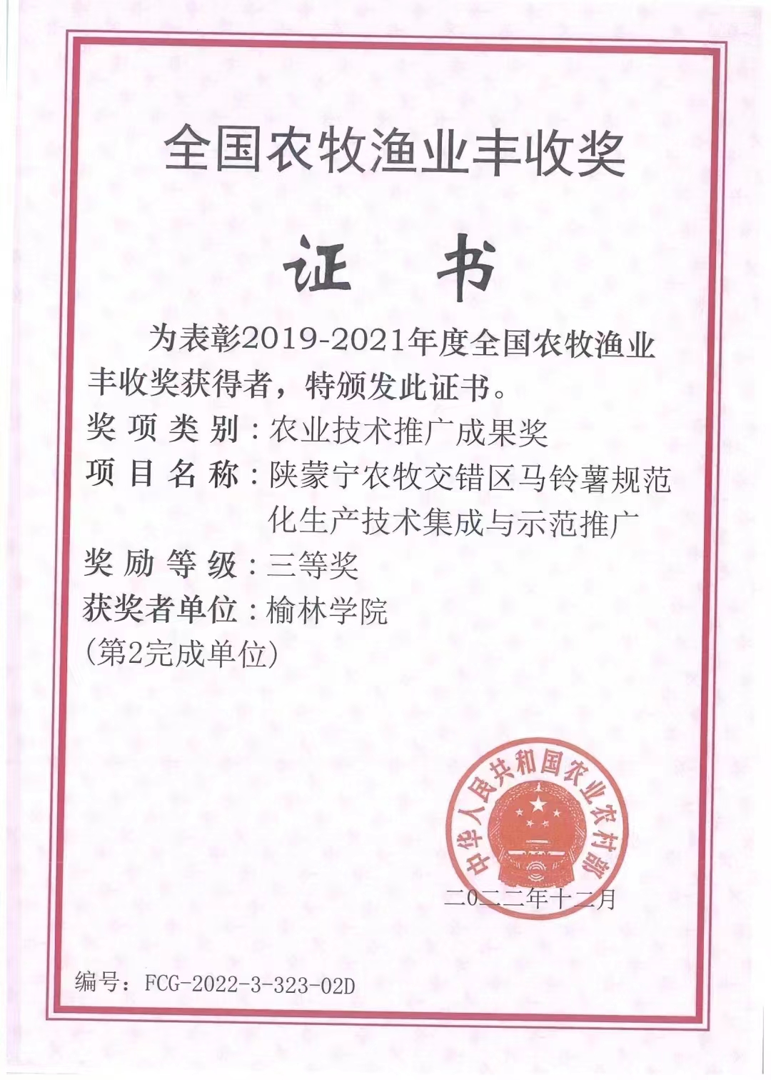 近日,从省农业农村厅获悉,由bat365正版唯一官网教育学院、榆林市农业科学研究院等单位共同申报的《陕蒙宁农牧交错区马铃薯规范化生产技术集成与示范推厂》荣获全国农牧渔业丰收奖三等奖。
