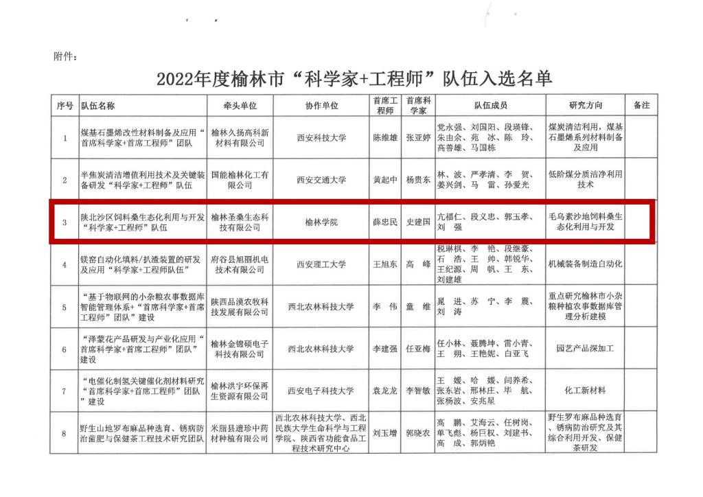 近日,榆林市科技局公布了2022年度榆林市秦创原“科学家+工程师”队伍入选名单,bat365陕北沙区饲料桑生态化利用与开发、陕北矿区水资源保护技术2支秦创原“科学家+工程师”队伍上榜。每支队伍,榆林市给予10万元支持。
