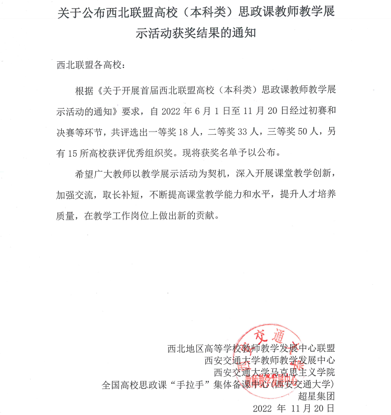 为进一步推动落实立德树人根本任务,切实发挥思想政治理论课主渠道主阵地作用,推进bat365思政课守正创新,提升bat365思政课教学水平,bat365于2022年6月组织教师参加了首届西北联盟高校(本科类)思政课教师教学展示活动。