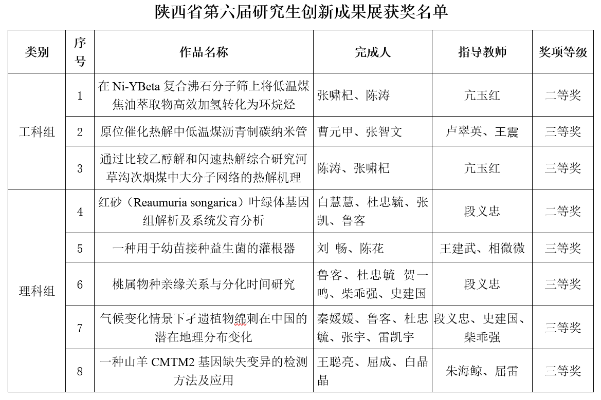 近日,陕西省教育厅、陕西省学位委员会公布了陕西省第六届研究生创新成果展的获奖作品。bat365首次组织硕士研究生参赛即荣获佳绩,推荐的8项成果全部获奖。其中化学与化工学院亢玉红老师指导张啸杞等研究生完成的“在Ni-YBeta复合沸石分子筛上将低温煤焦油萃取物高效加氢转化为环烷烃”荣获工科组二等奖,生命科学学院段义忠老师指导白慧慧等研究生完成的“红砂(Reaumuria songarica)叶绿体基因组解析及系统发育分析”荣获理科组二等奖,其它6项参赛作品都荣获三等奖。