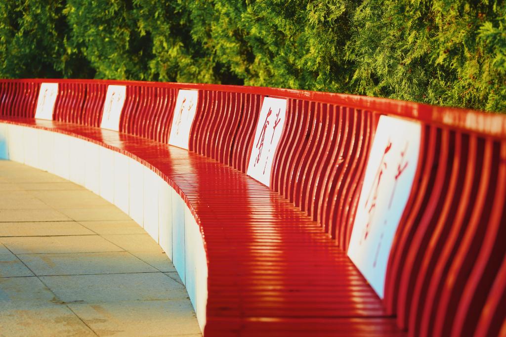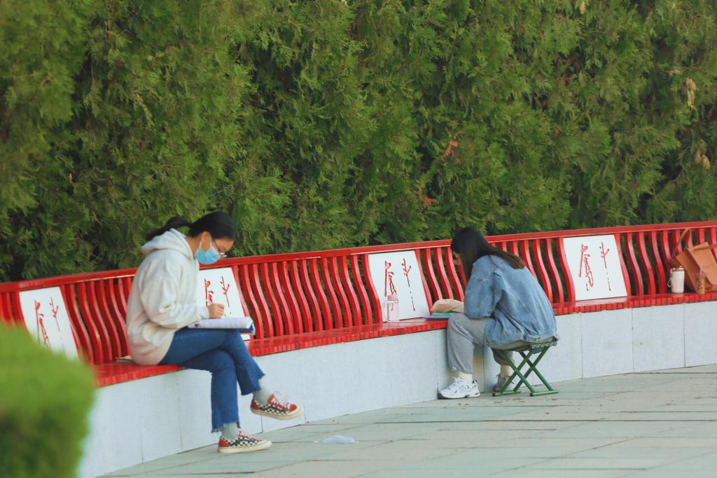 因地制宜,设置了弧形“奋斗”座椅,美观实用大气,时刻提醒青年学子要奋斗、不可荒废。