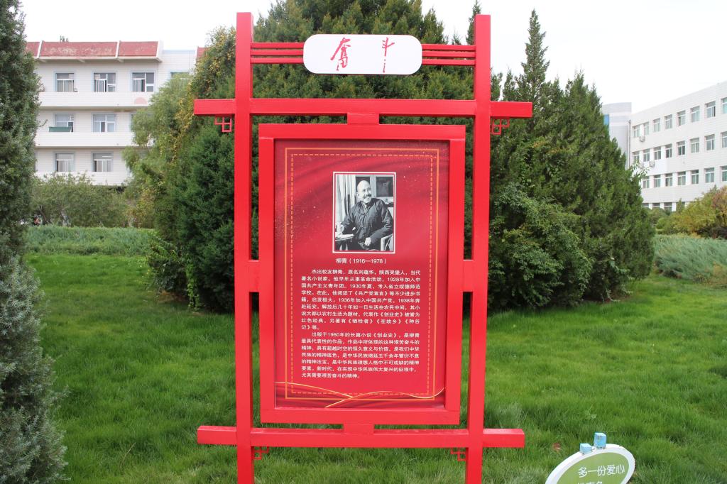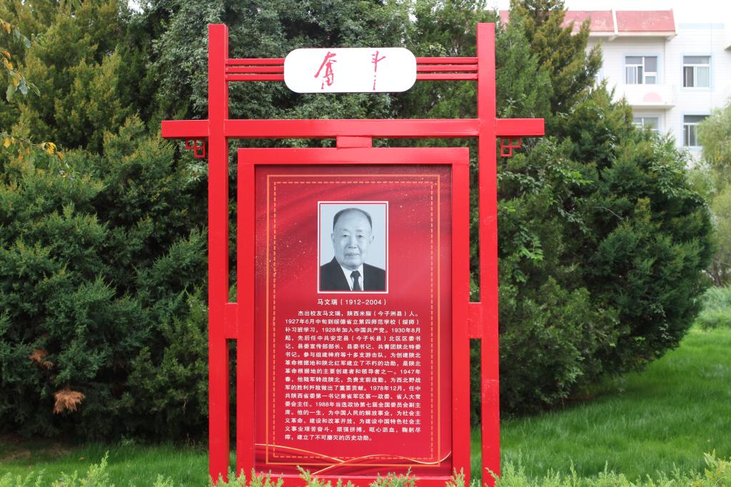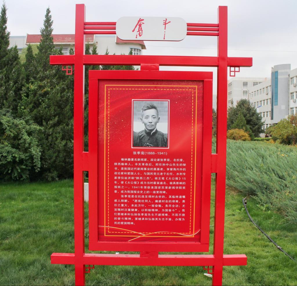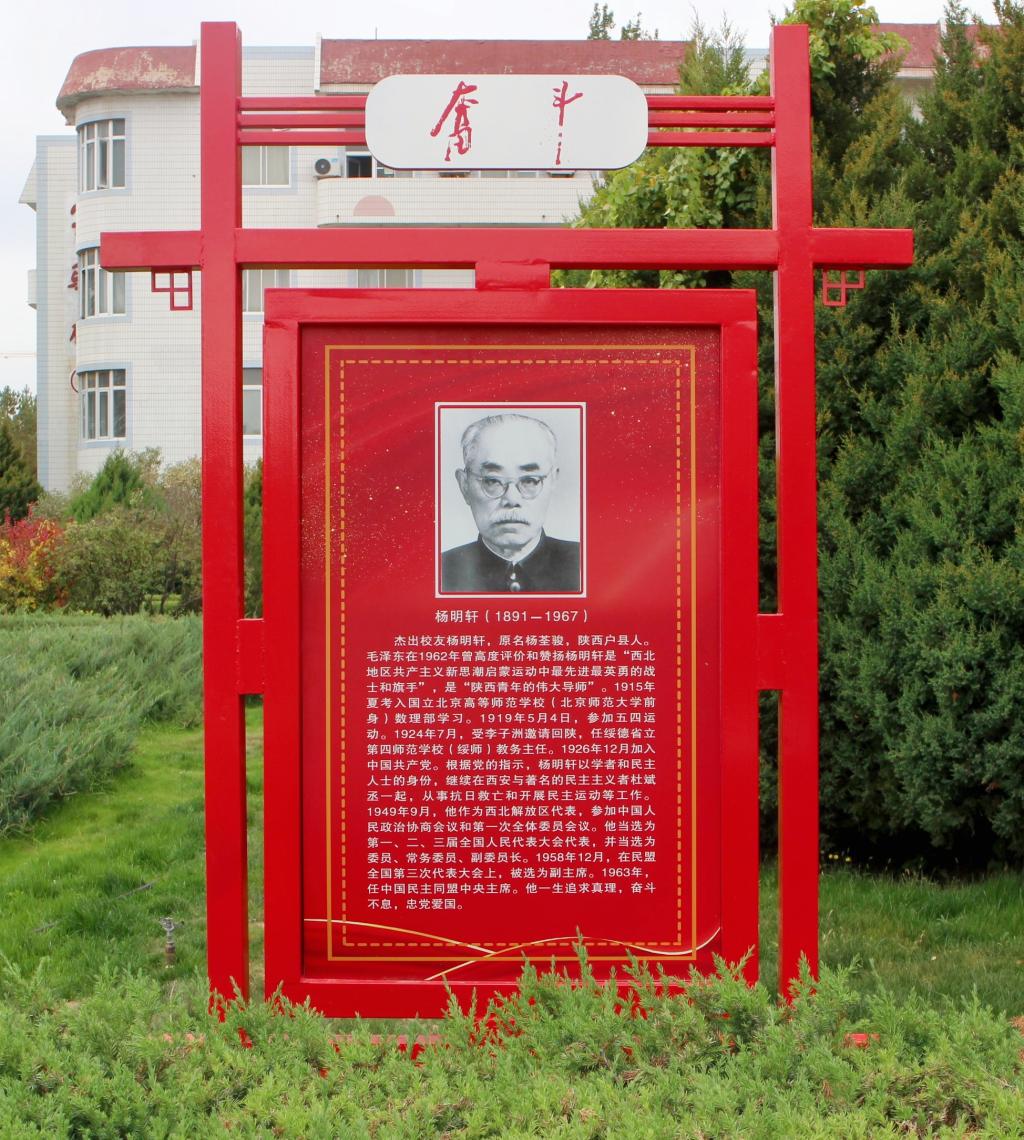 奋斗广场红色文化元素丰富,凸显育人功能,人物宣传栏有6位是杰出校友和2位榆林名人。