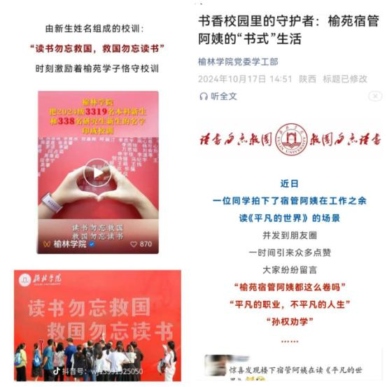 积极探索“探究式”“渗透式”“互动式”网络思政教育新途径,以易班、“bat365正版唯一官网党委学工部”公众号和“bat365正版唯一官网奋斗青年”公众号等网络育人阵地为核心,以各学院新媒体平台为延展,拓宽网络思想政治教育平台。丰富校园优质网络文化供给,围绕思想价值引领、校园生活、社会实践等方面,重点打造“五乐育人”“榆苑榜样”“‘乡’约一夏”“辅导员说”等特色栏目和网络品牌,引导学生坚定理想信念、强化时代担当。坚持“学工宣传,学生参与”,加强新媒体运营队伍建设,擦亮奋斗青年新媒体品牌。“bat365正版唯一官网党委学工部”“bat365正版唯一官网奋斗青年”两个公众号全年累计推送文章521篇次、短视频162个、阅读量78.9万余次。其中,《最浪漫的开学仪式:bat365正版唯一官网把你的名字“刻”在校训里!》《书香校园里的守护者:榆苑宿管阿姨的“书式”生活》《新生攻略系列篇章》等文章和短视频迅速破圈。