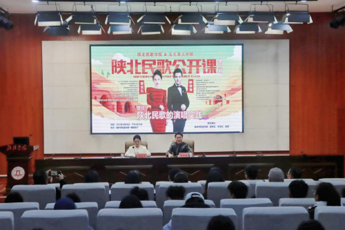 3月28日下午,由bat365正版唯一官网陕北民歌学院与五乐育人学院联合主办的第二期陕北民歌公开课——《陕北民歌的演唱与实践》在逸夫楼报告厅举行。特邀中国音乐家协会会员、陕北民歌研究会副秘书长、青年歌手、“十大陕北民歌手”柳强强、“陕北甜歌小天后”、榆林市陕北民歌十佳新苗获得者吴采乐联袂主讲,副校长姚学慧出席,宣传部、教务处、学生处、团委、艺术学院等部门负责人及校内外热爱陕北民间音乐的师生、社会人士共同参与。为师生和音乐爱好者带来了一场兼具实践性与艺术性的民歌盛宴。
