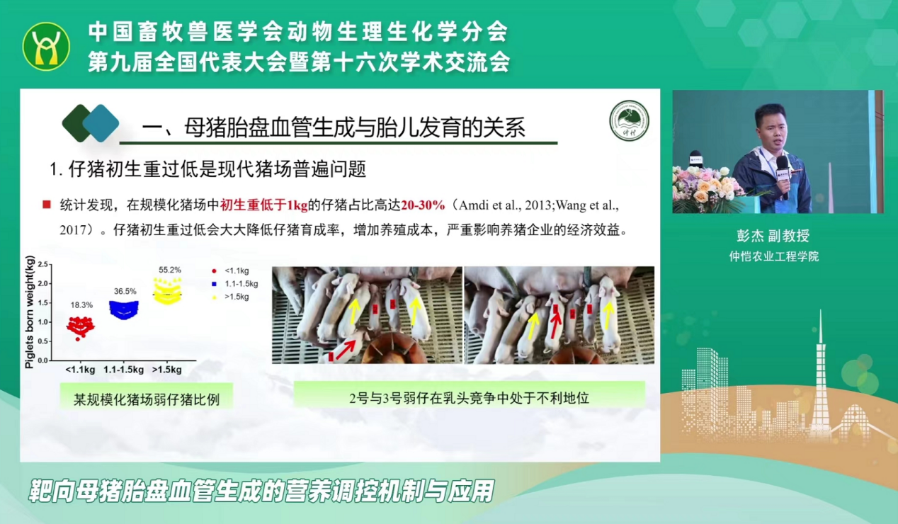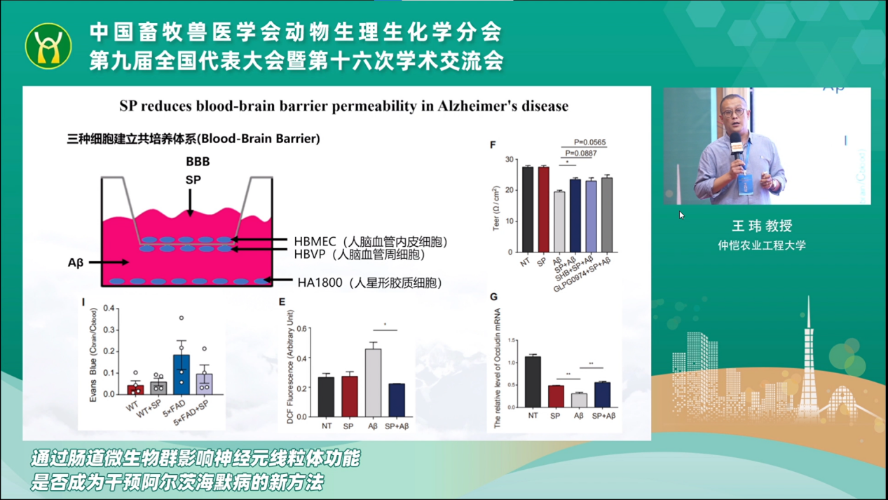 本次大会共有29位国内同行专家围绕动物采食调控、肠道健康、营养免疫调控、动物克隆等领域进行学术交流。kaiyun官网动物生理学科王玮教授、彭杰副教授、周烁副教授3人受邀做了大会报告。王玮教授以《通过肠道微生物群影响神经元线粒体功能,是否成为干预阿尔茨海默病的新方法》为题,介绍了课题组在阿尔茨海默症发病机理和调控策略上的研究进展。彭杰副教授做了《靶向母猪胎盘血管生成营养调控机制与应用》的主题报告,分享了团队在母猪胎盘血管受限的分子机制解析和营养调控上的大量工作。周烁老师就《GSPs对自噬引起的蛋鸡卵泡颗粒细胞氧化损伤的保护作用》做了大会报告,展示团队在禽类卵泡闭锁分子机制解析和调控上取得新进展。三位老师的报告充分展示了kaiyun官网动物生理生化学科的学术水平,受到与会专家的充分肯定和高度关注。